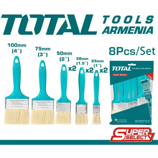 TOTAL THT8450801 նկարելու համար տարբեր հաստության հարթ վրձինների հավաքածու : Յուրաքանչյուր գործիքի մազերը ապահով կերպով ամրացված են մետաղական ժապավենով : Փայտե բռնակները հագեցած են կախելու համար անցքերով :