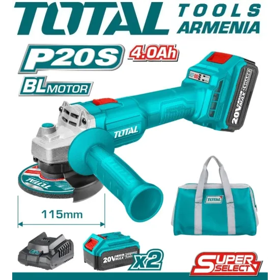 - Մարտկոցով աշխատող անկյունային հղկող մեքենա Total TAGLI201572- ը օգտագործում է 20 վ մարտկոց, ինչը թույլ է տալիս աշխատել ավելի արագ և հարմարավետ: