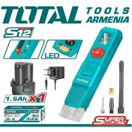 - TOTAL TACLI12011 վերալիցքավորվող մեքենայի կոմպրեսորը ավտոմեքենայի և մոտոցիկլետի անվադողերի փչման սարք է, որը հարմար է նաև փչովի գնդակների և նավակների համար :