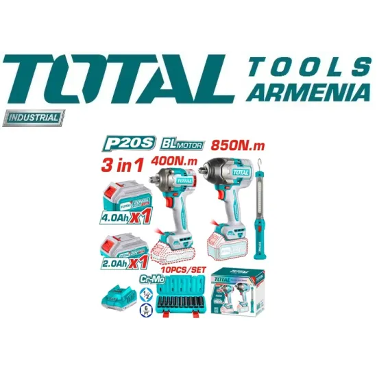 | Կոմպլեկտում | 10 հատ 1/2"" DR Հարվածային վարդակների հավաքածու (Նյութ՝ Cr-MO, Չափս՝ 10.12.13.14.15.17.19.21.22.24 մմ) 1 հատ 4.0Ah մարտկոց (TFBLI20021) 1 հատ 2.0Ah մարտկոց (TFBLI20011) 1 հատ լիցքավորիչ (TFCLI2001) |