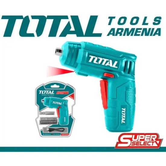 Total TSDLI0402 պտուտակահանը թույլ է տալիս 0.8-ից 10 մմ տրամագծով բիթերի և գայլիկոնների արագ և հուսալի ամրացում : LED լուսային լուսավորությունը և լիցքի կարգավիճակի ցուցիչը հեշտացնում են այս պտուտակահանով աշխատելը :