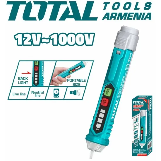 TOTAL THT29100026 ոչ կոնտակտային լարման դետեկտորը նախատեսված է մինչև 1000 վ լարման չափման համար : Այս մոդելը հագեցած է լապտերով , ինչը ավելի է հեշտացնում աշխատանքը մութ վայրերում :