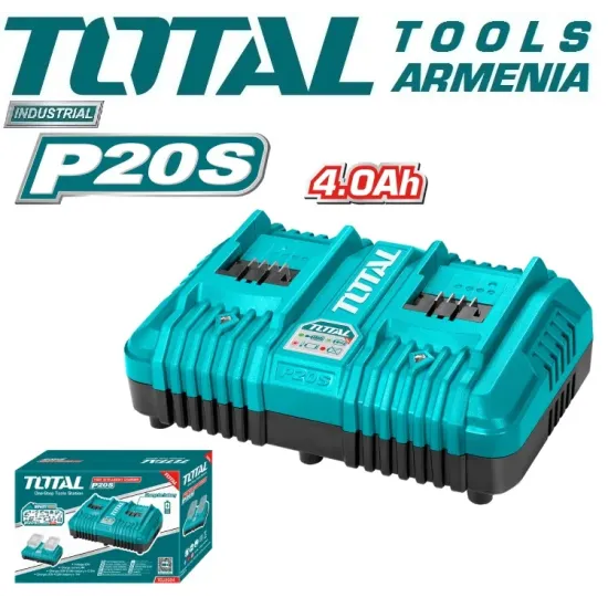 Արագ ինտելեկտուալ լիցքավորող TOTAL TCLI2024- ը հարմար է 20 Վ լարում ունեցող TOTAL մարտկոցներ լիցքավորելու համար : Մեկ մարտկոցի լրիվ լիցքավորումը տևում է մոտավորապես 1 ժամ :