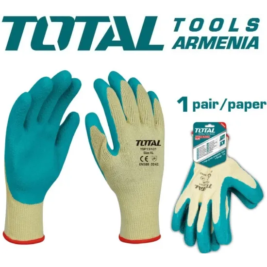TOTAL TSP13101 - աշխատանքային ձեռնոցները օգտակար են տարբեր աշխատանքների համար : Պատրաստված է բամբակյա տրիկոտաժից և ունեն լատեքսային ծածկույթ : Ձեռնոցները խիստ դիմացկուն են ծակումների և պոռթկման դեմ , ինչպես նաև կանխում են գործիքների ձեռքից սահելը : Էլաստիկ մանժետները ամուր փաթաթվում են դաստակների վրա :