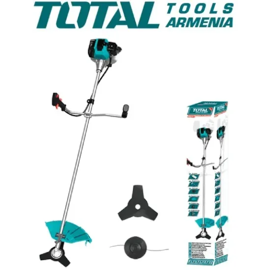 - TOTAL բենզինային խոտհնձիչը հուսալի , հավասարակշռված և հարմար գործիք է պարտեզի համար : Շնորհիվ իր էլեգանտ , էռգոնոմիկ ձևի , այն կարող է օգտագործվել ամենադժվար և անհասանելի վայրերում , որտեղ խոտհնձի օգտագործումը դժվար է : Ժամանակակից , լավ մտածված դիզայնը թույլ է տալիս ապահով կերպով պահել հարմարվողական սարքը ձեռքերում և կատարել աշխատանքը հեշտությամբ , արդյունավետորեն և առանց ջանքերի : TOTAL խոտհնձիչը հագեցած է 42.7 կուբ / սմ ծավալով բենզինային 2 - հարվածանոց շարժիչով , 1250 Վտ հզորությամբ ՝ 9000 պտտ / րոպե առավելագույն արագությամբ : Խոտհնձիչի վառելիքի բաքի ծավալը 1200 մլ է : Կտրող լայնությունը կազմում է 420 մմ : Կտրելու համար օգտագործվում է 2.4 մմ x 4 մ գիծ : Այն գազոնների և այգիների ամենօրյա խնամքի համար անփոխարինելի գործիք է : Օգտագործման հարմարավետության համար կոնստրուկցիան տրամադրում է երկրորդ բռնակ :