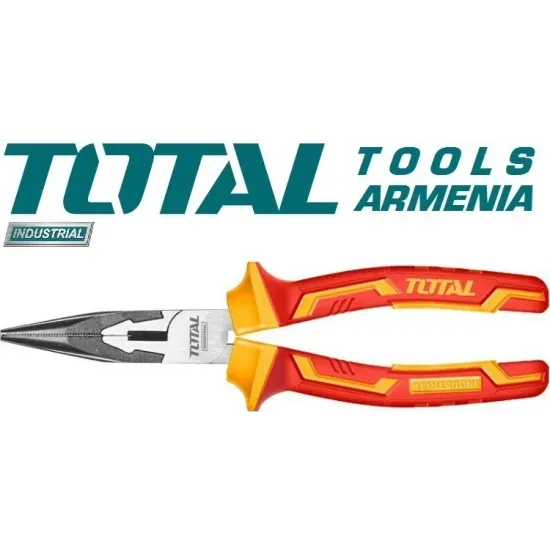 Դիէլեկտրական տափակաբերան աքցանները մինչև 1000 Վ, 200 մմ TOTAL THTIP2481 - ունեն կրկնակի մեկուսացում և իդեալական են բարձր լարման էլեկտրական աշխատանքի համար , մինչև 1000 Վ լարման տակ : Ապրանքը անհատապես փորձարկվել և հաստատվել է էլեկտրական կայաններում օգտագործման համար : Գործիքը շատ հարմար է օգտագործման համար , էրգոնոմիկ բռնակները հակասայթաքող ներդիրներով և պաշտպանիչ ճարմանդներով ապահովվում են հարմարավետ և անվտանգ աշխատանք :