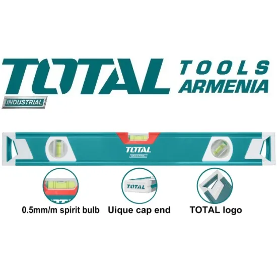 Ալյումինե կառուցվածքով 400 մմ երկարությամբ  TOTAL TMT2406  հարթաչափը օգտակար է շինարարության և հարդարման աշխատանքների համար :  Այն  օգտագործվում է  մակերեսի շեղումը հայտնաբերելու համար : Ապրանքը հագեցած է 3 աչքով : Գործիքը հուսալի է, ունի բարձր ուժ, իսկ ալյումինե պատյանը տարբերվում է դիմացկունությամբ :