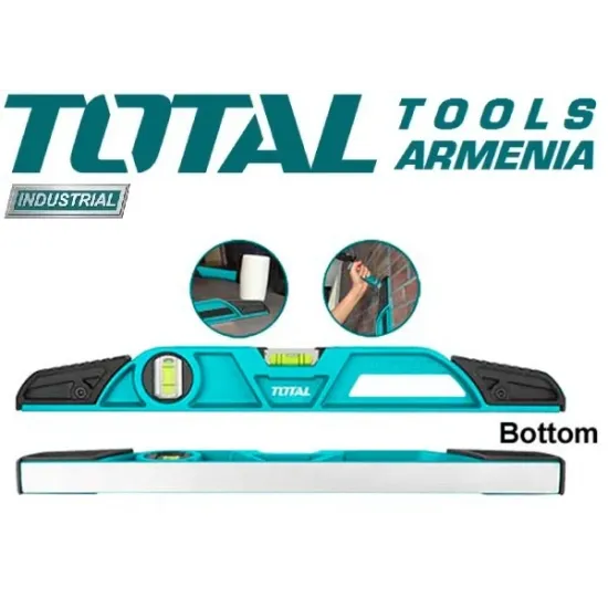 TOTAL TMT221406 ուժեղացված հարթաչափը՝ օգտագործվում է շինարարության , հարդարման , վերանորոգման աշխատանքներում ` հորիզոնական և ուղղահայաց մակերեսային շեղումները հայտնաբերելու համար : Գործիքը դիմացկուն է հարվածներին և ունի ուժեղացված կոնստրուկցիա : Ռետինե բամպերներն ու խցանները նախատեսված են հարվածը կլանելու համար՝ արտադրանքը պաշտպանելով վնասներից և վատթարացումից : Հասանելի են հորիզոնական և ուղղահայաց պղպջակների պարկուճներ : Ճշգրտությունը՝ 0,5 մմ / մ է :