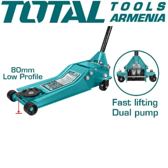 Արագ բարձրացում , կրկնակի պոմպ 3 տ TOTAL THT10834 - ը հարմար է օգտագործել գետնին ցածր հեռավորությամբ մեքենաների հետ աշխատելիս : Փոխադրունակությունը նախատեսված է թեթև մեքենաների հետ աշխատելու համար : Գործիքը տեղափոխելու համար կա երկար թև և բարձրացված հարմարավետ բռնակ: