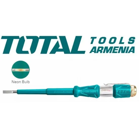 TOTAL THT291908 - ը թույլ է տալիս արագ որոշել լարումը 100-500 վ սահմաններում : Գործիքը պատրաստված է բարձրորակ նյութերից : Օգտագործողի հարմարավետության համար փորձարկվողը հագեցած է պլաստիկ կախիչով : Դրա կոմպակտությունն ու փոքր քաշը հեշտացնում են պահեստավորումը և օգտագործումը :