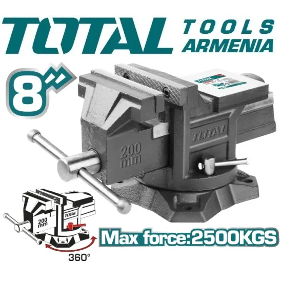 TOTAL THT6186 Փականագործական ամրակ զնդանով - օգտագործվում է փոքր կտորներ ամրացնելու համար : Օգտագործման դյուրինության համար մոդելն ունի առանցքային ֆունկցիա : Մարմինը պատրաստված է բարձր ամրության չուգունից : Լայն զնդանը թույլ է տալիս մուրճով աշխատել : Դաջված պողպատե ծնոտները ապահովվում են մասերի անվտանգ սեղմում : Ամրակը տեղադրվում է աշխատանքային նստարանին (դազգահին) ` մոնտաժային անցքերով :