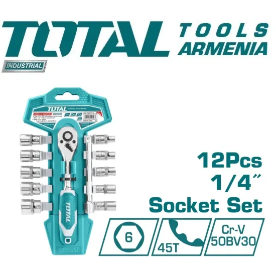 ԸՆԴԱՄԵՆԸ 12 հատ 1/4 "վարդակների հավաքածու TOTAL THT14114126 : Պարուրաձեւ միացումներով մոնտաժման , ապամոնտաժման , վերանորոգման աշխատանքների գործիքների ամբողջություն : Տեղադրման չափը ՝ 1/4" : Ռակետկա մեխանիզմով բռնակը հագեցած է հատուկ կոճակով , որի շնորհիվ գլուխների փոփոխությունն ավելի արագ է կատարվում : Աշխատանքային մասերը պատրաստված են քրոմապատ քրոմ-վանադիումային պողպատից ինչն էլ գործիքին տալիս է ուժ և երկար աշխատանքային սպասարկում : Բռնակը հարմար է օգտագործման համար և չի սահում : Առկա կախիչը թույլ է տալիս գործիքը կոկիկ պահել :