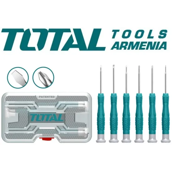 Ճշգրիտ մեխանիկայի պտուտակահանների հավաքածու 6 հատ : TOTAL THT250PS0601 - ը օգտակար է ճշգրիտ աշխատանքներ կատարելու համար , օրինակ ` էլեկտրական սարքավորումները վերանորոգելու համար : Հավաքածուն ներառում է տարբեր չափերի 6 պտուտակահան ՝ երեք տեսակի հուշումներով ՝ ուղիղ բնիկ , ֆիլիպսի բնիկ : Հավաքածուից բոլոր պտուտակահանների տարբերակիչ առանձնահատկությունը էրգոնոմիկ բռնակի առկայությունն է , որը հատկապես կարևոր է ճշգրիտ աշխատանքի համար : Բռնակները հարմար տեղավորվում են ձեռքի մեջ և չեն սայթաքում : Պտուտակահանների աշխատանքային մասը պատրաստված է քրոմ վանադիումի պողպատից` բարձր ամուր նյութից`  երկար շահագործման ժամկետով :