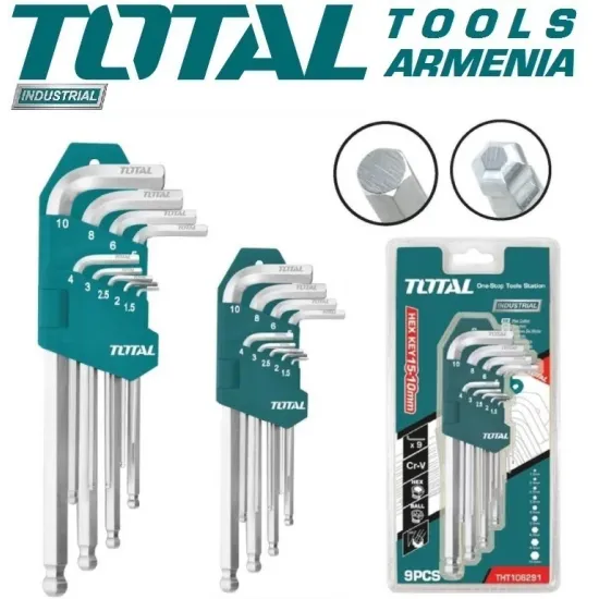 Գնդիկավոր վեցանկյուն բանալիների հավաքածու  9 հատ  TOTAL THT106291- ը ձեռքի գործիքների հավաքածու է ՝ մխոցավոր պտուտակների տեղադրման  կամ ապամոնտաժման համար : Հավաքածուն օգտակար կլինի ավտոտնակում, ավտոտեխսպասարկման կետում կամ տանը : Պլաստմասե կրիչը ապահովում է կոմպակտ պահպանում և բանալիների հեշտ տեղափոխում :