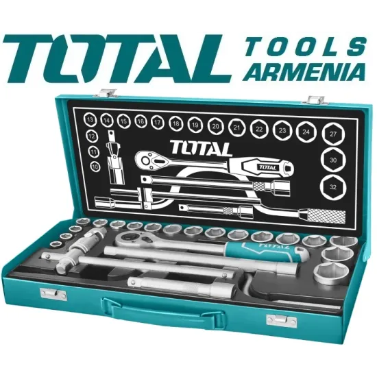 TOTAL 1/2 24 հատ THT141253 - ը  օգտագործվում է մեքենաների սպասարկման համար , ինչպես ավտոտեխսպասարկումներում , այնպես էլ կենցաղային պայմաններում : Հավաքածուի մեջ ներառված պարագաները նախատեսված են 1/2 "միացման չափի համար : Գործիքների և հավաքածուի աշխատանքային մասերը պատրաստված են կարծրացված քրոմ - վանադիումի պողպատից , որը դիմակայում  է կոռոզիային և դեֆորմացիային : Հուսալի և ամուր պատյանը  հեշտացնում է փոխադրումը և ապահովում գործիքների պահպանումը :