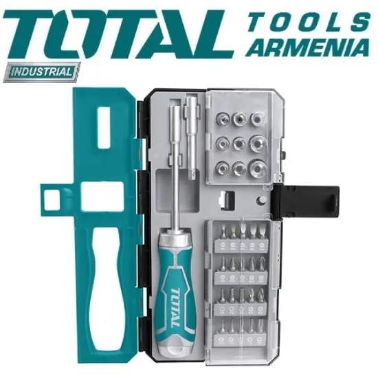 TOTAL TACSD30336 - ը հուսալի գործիք է պարուրաձև միացումներով հավաքման և ապամոնտաժման աշխատանքների համար : Հագեցած է արգելակիչ մեխանիզմով և հակադարձմամբ : Կարող է օգտագործվել անցքերի տեսակներով ամրացումների հետ ` PH , PZ , SL , HEX , TORX : Մեծ թվով վարդակների գլխիկների և տարբեր չափերի պտուտակահան բիտերի առկայության պատճառով գործիքը ունի օգտագործման լայն շրջանակ : Պտուտակահանի առավելություններն են նաև լիսեռի ուժը , հուշումները և էրգոնոմիկ բռնակը : Պահեստավորման և տեղափոխման հեշտության համար հավաքածուն փաթեթավորված է պլաստիկ տուփի մեջ :