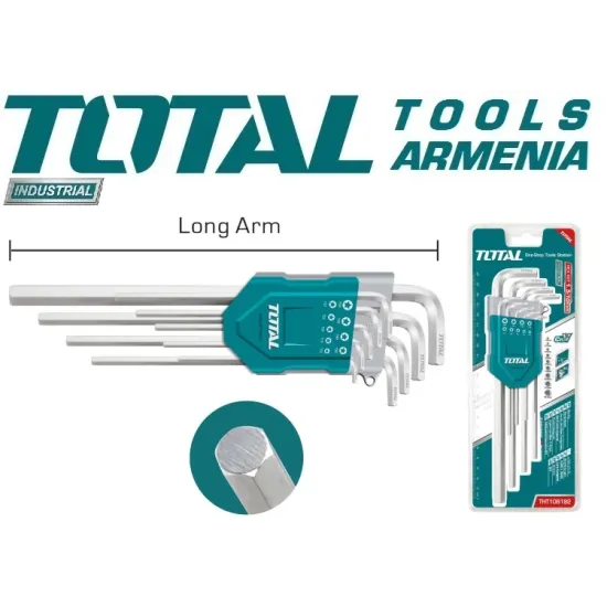 Իմբուսի բանալիների հավաքածու 9 հատ : TOTAL THT106192 - ն օգտագործվում է վեցանկյուն վարդակով ամրացումները պտուտակելու և անջատելու համար : Բանալիների երկարաձգված ձևը օգնում է աշխատանքներ իրականացնել անգամ դժվարամատչելի վայրերում : Գործիքները պատրաստված են քրոմ վանադիումի պողպատից ՝ ամրության և երկար շահագործման համար :