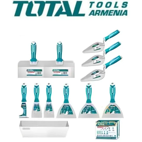 Կոմպլեկտում 1 հատ 9-ը 1-ում նկարարական գործիք։ 1 հատ 80 մմ / 2,5 դյույմ ծեփամածիկ մալա։ 1 հատ 80 մմ /3 դյույմ ծեփամածիկ մալա։ հատ 100 մմ/4 դյույմ ծեփամածիկ մալա։ 1 հատ 125 մմ / 5 դյույմ ծեփամածիկ մալա։ 1 հատ 150 մ/ 6 դյույմ ծեփամածիկ մալա։ 1 հատ 2օմմ/ 8 դյույմ չժանգոտվող պողպատից ժապավենային դանակ։ 1 հատ 250 մմ / 10 դյույմ չժանգոտվող պողպատից ժապավենի դանակ։ 1 հատ 150 մմ / 6 դյույմ աղյուսապատման մալա։ 1 հատ 180 մմ/ 7 դյույմ աղյուսապատ մալա։ 1 հատ 20 մմ / 8 դյույմ աղյուսապատման մալա։ 1 հատ 350 մմ/ 14 դյույմ չժանգոտվող պողպատից ցեխի թավան։