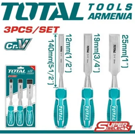 Փայտե սայրերի (դուր) հավաքածու 3 հատ : TOTAL THT41K0302 - Ձեռքի ատաղձագործական գործիքների ամենատարածված չափերի շարք : Սայրի աշխատանքային մասը պատրաստված է քրոմ-վանադիումային պողպատից և  ունի բարձր դիմացկունություն : Էրգոնոմիկ բռնակները ապահովում են արտադրանքի անվտանգ ֆիքսումը ձեռքում և չեն սայթաքում :