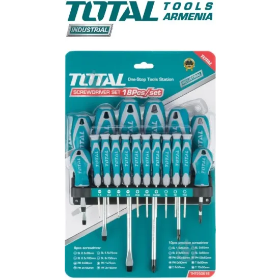• TOTAL THT250618 - ը  մեծ ունիվերսալ  հավաքածու է , որը հարմար է տարբեր տեսակի աշխատանքների համար : Հավաքածուն ներառում է 4 պտուտակահան ՝ ուղիղ անցքով ,  ամրացումների սպասարկման համար , 4 պտուտակահան ՝ խաչաձև գլխով  և 10 մանրանկարչություն պտուտակահան ՝ ճշգրիտ աշխատանքի համար : Գործիքների լիսեռները պատրաստված են քրոմ վանադիումի պողպատից ,  չեն վախենում կոռոզիայից և դեֆորմացիայից : Հարմարավետ բռնակները պատրաստված են չսայթաքող նյութերից և հագեցած են կախովի անցքերով :