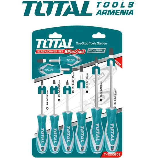 TOTAL THT250608 - ը օգտագործվում է ուղիղ և խաչաձեւ անցքերով ամրացման աշխատանքներ կատարելիս : Հավաքածուն բաղկացած է պահանջվող չափերի պտուտակահաններից, որոնք կազմված են կախելու համար անցքերից : 4 պտուտակահանն ունեն ուղիղ անցք , 4 - ը ՝ խաչաձեւ : Քրոմ վանադիումի պողպատը , որից պատրաստված են գործիքի ձողերը , ունեն երկար պիտանելիության ժամկետ , չեն վախենում կոռոզիայից և դեֆորմացիայից : Բռնակները պատրաստված են հակասայթաքուն պոլիմերային նյութերից , ինչը ապահովվում է պտուտակահանների հարմարավետ օգտագործումը :