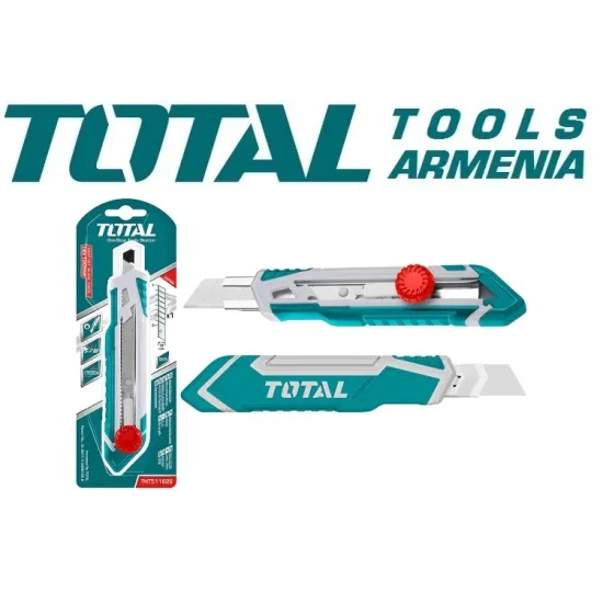 TOTAL THT511826 - ն օգտագործվում է թուղթ , ստվարաթուղթ , պաստառ , բարակ գորգեր և այլ նյութեր կտրելու համար : Եզրագծային բռնակն ապահովվում է անվտանգ բռնումը ՝ առանց սայթաքելու : Սայրը պատրաստված է ճապոնական ածխածնային պողպատից ` SK - 5 : Նորաձեւ կառուցվածքը շեշտում է մոդելի բոլոր դրական կողմերը :