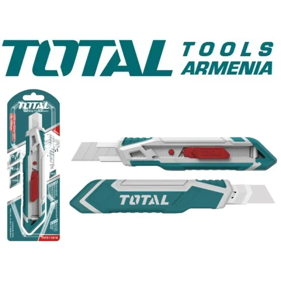 TOTAL THT511816 - ն օգտագործվում է թուղթ , ստվարաթուղթ , պաստառ , բարակ գորգեր և այլ նյութեր կտրելու համար : Եզրագծային բռնակն ապահովում է անվտանգ բռնում ՝ առանց սայթաքելու : Սայրը պատրաստված է ճապոնական ածխածնային պողպատից ` SK - 5 : Նորաձեւ կառուցվածքը շեշտում է մոդելի բոլոր դրական կողմերը :