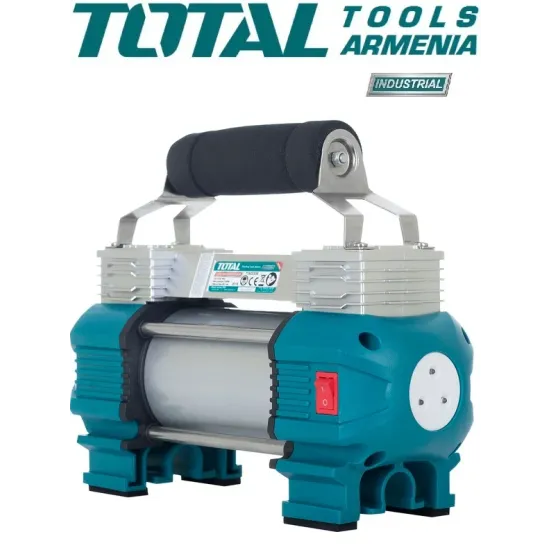 • TOTAL TTAC2506 մեքենայի օդային կոմպրեսորը օգտագործվում է ավտոմեքենաների և մոտոցիկլետների անվադողերի փչման համար : Սարքը բնութագրվում է ցածր աղմուկի մակարդակով, փոքր չափսերով և հեշտ գործարկմամբ :