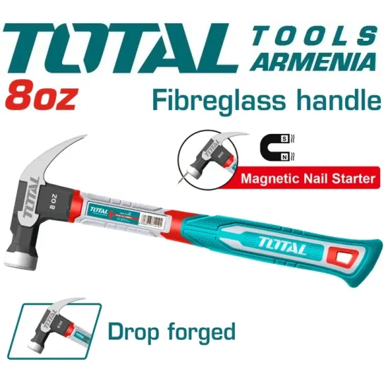 TOTAL THCH61008 - ը հարվածային գործիք է , որը օգտակար է ատաղձագործության ոլորտում և առօրյա կյանքում : Հարվածային ծայրը պատրաստված է կարծրացված 45 ածխածնային պողպատից , որի շնորհիվ այն ունի բարձր ամրություն և աշխատանքային զգալի ռեսուրս : Մի կողմից , այն ունի կլոր հարվածող մաս , իսկ մյուս կողմից՝ մեխահան : Ապակեթելային բռնակը կանխում է գործիքի սահումը ձեռքից :