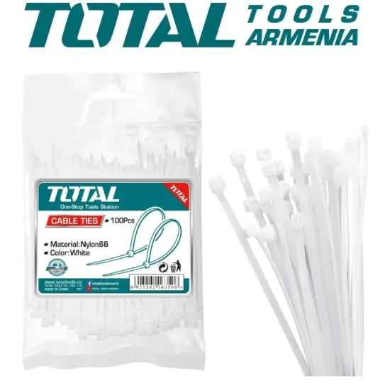 Ամրացուցիչներ 3.6 x 200 մմ, 100 հատ : TOTAL THTCT2001 - ն օգտագործվում է լարերը և ճկուն խողովակները ամրացնելու , դրանք միմյանց հետ քաշելու , տեղափոխման և պահպանման հեշտության համար : Ապրանքը պատրաստված է փափուկ պոլիմերից ` հուսալի փական համակարգով , որն ապահովում է գործիքի երկար շահագործումը :