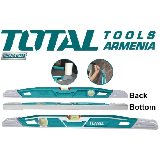 TOTAL TMT221606 ուժեղացված հարթաչափը՝ օգտագործվում է շինարարության , հարդարման , վերանորոգման աշխատանքներում ` հորիզոնական և ուղղահայաց մակերեսային շեղումները հայտնաբերելու համար : Գործիքը դիմացկուն է հարվածներին և ունի ուժեղացված կոնստրուկցիա : Ռետինե բամպերներն ու խցանները նախատեսված են հարվածը կլանելու համար՝ արտադրանքը պաշտպանելով վնասներից և վատթարացումից : Հասանելի հորիզոնական և ուղղահայաց պղպջակների պարկուճներ : Ճշգրտությունը՝ 0,5 մմ / մ է :