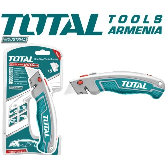 TOTAL THT5126128 - ի հետ քաշվող կիսաթեք բերանով դանակը ձեռքի գործիք է բարակ նյութերը կտրելու համար ` կաշի , կաուչուկ , պաստառ , ՊՎՔ վահանակներ , լինոլեում : Օգտագործվում է վերանորոգման և շինարարական աշխատանքներում : SK5 պողպատից պատրաստված հետ քաշվող շեղբը ունի կիսաթեք ձև : Գործիքը դիմացկուն է : Նրա պարզ , էրգոնոմիկ ձևը ապահովվում է օգտագործման հարմարավետությունը :