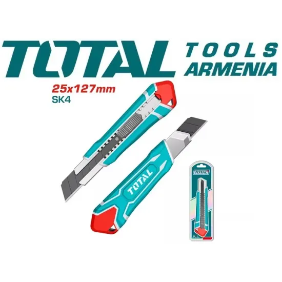 TOTAL THT5112505 - ն օգտագործվում է թուղթ , ստվարաթուղթ , պաստառ , բարակ գորգեր և այլ նյութեր կտրելու համար : Եզրագծային բռնակն ապահովվում է անվտանգ բռնումը ՝ առանց սայթաքելու : Սայրը պատրաստված է ճապոնական ածխածնային պողպատից ` SK - 4 : Նորաձեւ կառուցվածքը շեշտում է մոդելի բոլոր դրական կողմերը :