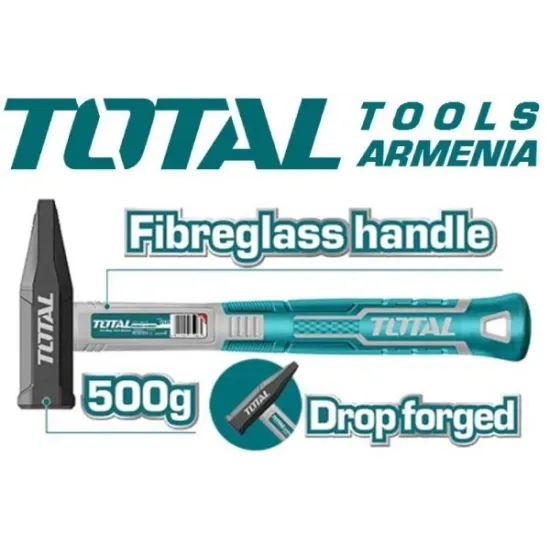 500 գ TOTAL THTMH5006 - փականագործական մուրճը հարմար ձեռքի գործիք է, որով կարելի է մեխեր խփել և կատարել մի շարք այլ հարվածային ախատանքներ սպասարկման և վերանորոգման արհեստանոցներում, արտադրությունում, ինչպես նաև օգտագործել առօրյա գործեր կատարելու համար : Մուրճը բաղկացած է պողպատե հարվածային մասից և էրգոնոմիկ ապակեթելային բռնակից, որը ունակ է հարվածի ժամանակ կլանել թրթռումը՝ ինչի արդյունքում ձեռքը ավելի քիչ է հոգնում : Ապակեթելքի երկրորդ կարեւոր առավելությունը դրա հակասայթաքող հատկությունն է ՝ աշխատանքի ընթացքում գործիքը ձեռքից չի սայթաքում :