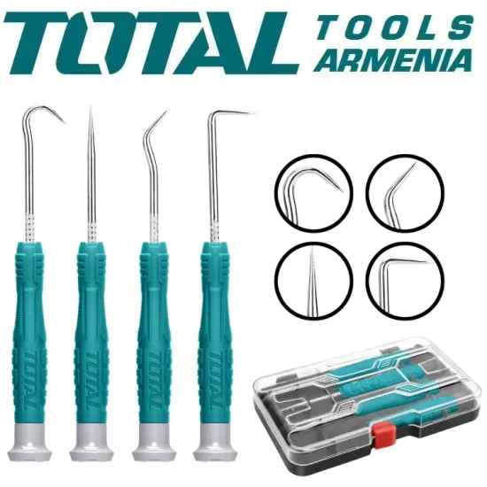 Փականագործական կեռերի և բզի հավաքածու 4 հատ TOTAL TPHSK0401 - հարմար է լայն շրջանակի աշխատանքի համար : Խիտ նյութերի անցքեր , մետաղական մասերի նշում , կնքման տափօղակների ապամոնտաժում , օղակներ, յուղային կնիքներ և այլն փականագործի աշխատանք կատարելիս :