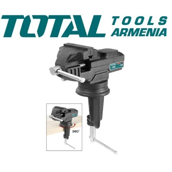 TOTAL THT6126 Փականագործական ամրակ - օգտագործվում է փոքր կտորներ ամրացնելու համար : Օգտագործման դյուրինության համար մոդելն ունի առանցքային ֆունկցիա : Մարմինը պատրաստված է բարձր ամրության չուգունից : Դաջված պողպատե ծնոտները ապահովվում են մասերի անվտանգ սեղմում :