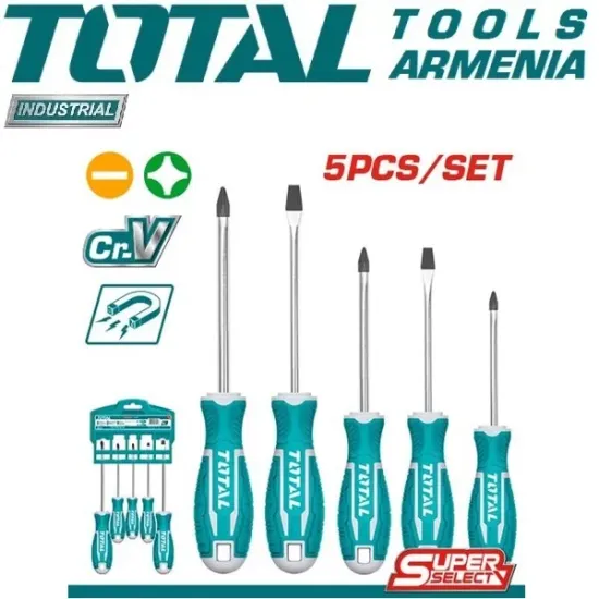 TOTAL THT2506052 - ը օգտագործվում է  ուղիղ և խաչաձեւ անցքերով ամրացման աշխատանքներ կատարելիս : Հավաքածուն բաղկացած է պահանջվող չափերի պտուտակահաններից, որոնք կազմված են  կախելու համար  անցքերից : 2 պտուտակահանն ունեն ուղիղ անցք , 3 - ը ՝ խաչաձեւ : Քրոմ վանադիումի պողպատը , որից պատրաստված են գործիքի ձողերը , ունեն  երկար պիտանելիության ժամկետ , չեն վախենում կոռոզիայից և դեֆորմացիայից : Բռնակները պատրաստված են հակասայթաքուն  պոլիմերային նյութերից , ինչը ապահովվում է պտուտակահանների հարմարավետ օգտագործումը :