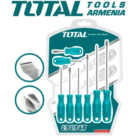 TOTAL THTDC250801 - ը օգտագործվում է  ուղիղ և խաչաձեւ անցքերով ամրացման աշխատանքներ կատարելիս : Հավաքածուն բաղկացած է պահանջվող չափերի պտուտակահաններից, որոնք կազմված են  կախելու համար  անցքերից : 4 պտուտակահաններն ունեն ուղիղ անցք , 4 - ը ՝ խաչաձև : Քրոմ վանադիումի պողպատը , որից պատրաստված են գործիքի ձողերը , ունեն  երկար պիտանելիության ժամկետ , չեն վախենում կոռոզիայից և դեֆորմացիայից : Բռնակները պատրաստված են հակասայթաքուն  պոլիմերային նյութերից , ինչը ապահովվում է պտուտակահանների հարմարավետ օգտագործումը :