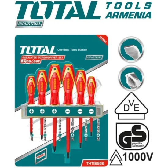 Դիէլեկտրական պտուտակահանների հավաքածու մինչև 1000 Վ, 6 հատ : TOTAL THTIS566 - ը մեկուսացված պտուտակահանների շարք է, որը ներառում է 3 ծակոտի և 3 խաչաձև պտուտակահան : Գործիքները հարմար են մինչև 1000 Վ պարուրաձև միացումներով աշխատելու համար : Պտուտակահանների հարմար պահպանման համար ներառված է ալյումինե ամրակ: Հավաքածուն մատակարարվում է պլաստիկ բլիստերով :