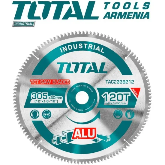 TOTAL TAC2339212 - նախատեսված է ալյումինով ՝ երկայնական և խաչաձեւ կտրվածքներ կատարելու համար : Ատամներն ամրացված են կարբիդային ներդիրներով ` արտադրողականության բարձրացման և շեղբի պիտանելիության համար : Նրանք երեք կողմերից խտացված են ՝ կտրող եզրերին հերթափոխվող թեքերով : Այս ատամները զգալիորեն երաշխավորում են մաքուր կտրումը :