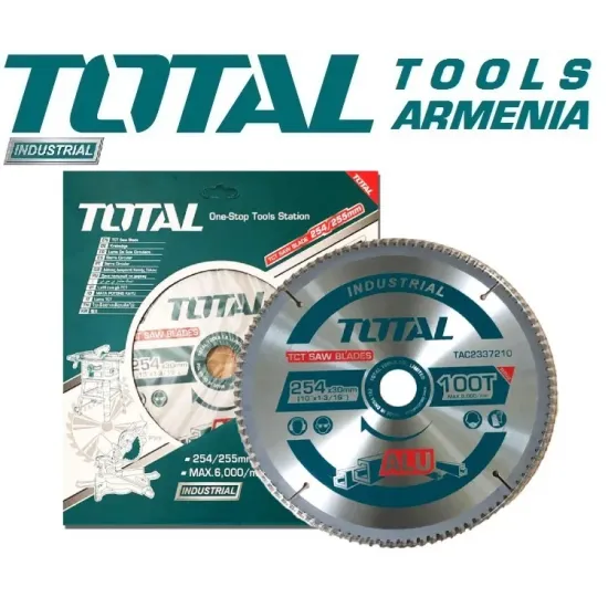 TOTAL TAC2337210 - նախատեսված է ալյումինով երկայնական և խաչաձեւ կտրվածքներ կատարելու համար : Ատամներն ամրացված են կարբիդային ներդիրներով ` արտադրողականության բարձրացման և շեղբի ծառայության պիտանելիության համար : Դրանք երեք կողմերից խտացված են ՝ կտրող եզրերին հերթափոխվող թեքերով : Այս ատամները զգալիորեն երաշխավորում են մաքուր կտրումը :