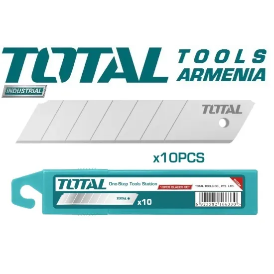 TOTAL THT5192501 դանակների հավաքածուն ունի 10 շեղբեր 25x127 մմ չափի, նախատեսված է գրասենյակային և շինարարական դանակների համար : Սայրերը պատրաստված են բարձրորակ պողպատից և ունեն պաշտպանիչ սրիչ : Նրանց դիզայնը թույլ է տալիս կտրել բերանի փոքր հատվածները ամեն անգամ , երբ դանակի ծայրը բութ է , դրանով իսկ ավելացնելով դանակի կտրող հատկությունները :