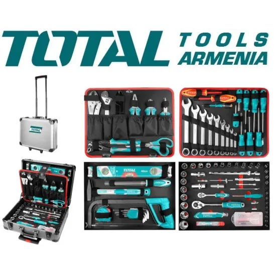 Կոմպլեկտում Քանակը հավաքածուի մեջ `147 հատ: Համակցված տափակաբերան աքցան, 1 հատ - 7 դյույմ (CR-V) 1 հատ - 6 " տափակաբերան աքցան (CR-V) 1 հատ - 6 " անկյունյին կտրիչներ (CR-V) 4 հատ - S2 տափակ պտուտակահան (երկգույն բռնակ) ՝ SL8x150 / SL6x125 / SL5x100 / SL6.5x38 3 հատ - S2 Phillips պտուտակահան (երկգույն բռնակ) ՝ PH2x150 / PH1x100 / PH2x38 1 հատ - 200 մմ կիսաշրջան պողպատե խարտոց 1 հատ - մակարդակ 400 մմ 1 հատ - 300 գ մեխանիկական մուրճ 1 հատ - Շրջանակ `մետաղյա սղոցի համար 300 մմ 1 հատ - պողպատե չափիչ ժապավեն 5M Ճռիկի գլխիկ 9 հատ: - 1.5 / 2 / 2.5 / 3/4/5/6/8/10 մմ 1 հատ - 8.5դյույմ մետաղալարի մաքրիչ 1 հատ - 10 դյույմ պոմպի տափակաբերան աքցան Բանալին, 8 դյույմ, 1 հատ: 1 հատ - 10 դյույմ թեք բանալին Էլեկտրական մկրատ 5.5 դյույմ - 1 հատ: 9 հատ - Համակցված բանալին - 6/8/10/12/14/15/17/19 / 22 մմ 1 հատ - մագնիսական կոճ 1/4 դյույմ 2 հատ - դիէլեկտրիկ պտուտակահան - SL5x125 / PH2x100 1 հատ - Թեստային մատիտ 1 հատ - ճռիկ 1/2 դյույմ , 45 տ․ 1 հատ - 1/4 դյույմ ճռիկ , 45 տ. 1 հատ - պտտվող բռնակ 1/4 դյույմ x 150 մմ: 1 հատ - ճկուն Երկարացման Ձող 1/4 դյույմ x 150 մմ 1 հատ - եռակողմ ադապտեր 1/2 դյույմ (F) x 3/8 դյույմ (M) 1 հատ - 1/2 դյույմ Գլխիկների Ունիվերսալ Կցորդիչ 1 հատ - 1/4 դյույմ Գլխիկների Ունիվերսալ Կցորդիչ 2 հատ - Երկարացման Ձող 1/2 դյույմ - 150 մմ (5") 250 մմ (10 ") 2 հատ - Երկարացման Ձող 1/4 դյույմ - 50 մմ (2") 100 մմ (4 ") 18 հատ - 1/2 դյույմ վեցանկյուն գլխիկ - 10, 11, 12, 13, 14, 15, 16, 17, 18, 19, 20, 21, 22, 23, 24, 27, 30, 32mm 13 հատ - 1/4 դյույմ վեցանկյուն գլխիկ - 4 / 4,5 / 5 / 5,5 / 6 / 7 / 8 / 9 / 10 / 11 / 12 / 13 / 14 մմ 2 հատ - 1/2 դյույմ Դոկտոր - 16 մմ / 21 մմ 1 հատ - Դանակ ՝ կոտրվող շեղբով 1 հավաքածու - 10 հատ շեղբեր 1 հատ - ճկուն երկարացման ձող `1/4դյույմ x 150 մմ: 1 հատ - Կրիչ Բիթերի Համար 1/4 դյույմ 10 հատ - 1 դյույմ (25 մմ) պտուտակահաններ. SL3 / SL4 / SL5 / SL6 / PH0 / PH1 / PH2 / PH3 / PZ0 / PZ1 36 հատ Պտուտակներ: Ինքնաձիգ պտուտակ ՝ մանրաթելերի համար - 5 մմ x 8 հատ / 2.5 մմ x 8 հատ Ինքնափոր պտուտակ - 2.5 մմ x 10 հատ / 5 մմ x 10 հատ 1 հատ - Մագնիսական բիտ կրող Փաթեթավորված է ալյումինե պատյանով