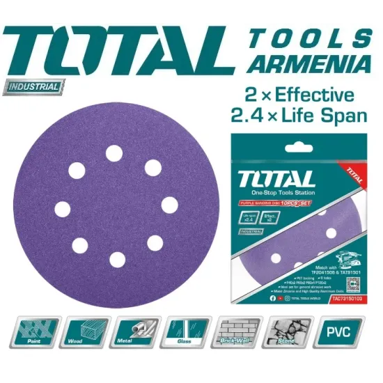 TOTAL TAC73150103  հղկող թերթերի հավաքածուն փոխարինող տարր է հղկող մեքենաների համար և օգտագործվում է փայտի , մետաղի վերամշակման , ներկի և լաքի ծածկույթների և ժանգի վերացման համար : Թիթեղները փորված են` հղկվող փոշին ավելի լավ հեռացնելու համար : Ձևը հարմար է փոքր տարածքների անկյունների և մակերեսների  հղկման համար : Պատրաստված է գործվածքների վրա հիմնված ալյումինե օքսիդից :