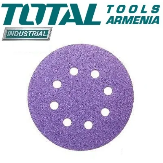 TOTAL TAC73150101  հղկող թերթերի հավաքածուն փոխարինող տարր է հղկող մեքենաների համար և օգտագործվում է փայտի , մետաղի վերամշակման , ներկի և լաքի ծածկույթների և ժանգի վերացման համար : Թիթեղները փորված են` հղկվող փոշին ավելի լավ հեռացնելու համար : Ձևը հարմար է փոքր տարածքների անկյունների և մակերեսների  հղկման համար : Պատրաստված է գործվածքների վրա հիմնված ալյումինե օքսիդից :
