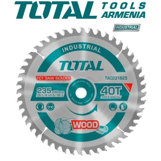 TOTAL TAC231725 - սղոցի բերանը նախատեսված է փայտի երկայնական և խաչաձև կտրման համար : Ատամներն ամրացված են կարբիդային ներդիրներով ` արտադրողականության բարձրացման և շեղբի պիտանելիության համար : Նրանք երեք կողմերից սրվում են կտրող եզրերին հերթափոխվող թեքերով : Այս ատամները զգալիորեն երաշխավորում են մաքուր կտրումը :