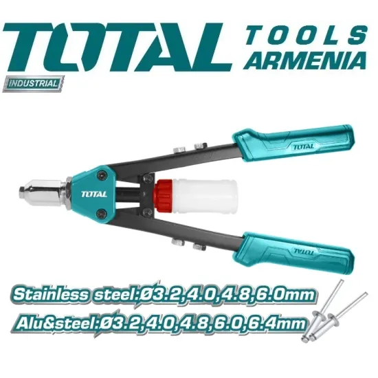 TOTAL 13 դյույմ ձեռքի ամրեցման սարքը (3.2 մմ, 4 մմ, 4.8 մմ, 6 մմ, 6.4 մմ) ամուր և վստահելի, ձեռքի գործիք է : Այս գամված ատրճանակն ունի բարձր ամրության ալյումին :