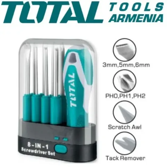 Կոմպլեկտում Պտուտակահան SL3.0 x 75 մմ - 1 հատ Պտուտակահան SL4.0 x 100 մմ - 1 հատ Պտուտակահան SL5.0 x 125 մմ - 1 հատ Պտուտակահան SL6.5 x 38 մմ - 1 հատ Պտուտակահան SL6.5 x 150 մմ - 1 հատ Պտուտակահան SL8.0 x 200 մմ - 1 հատ Պտուտակահան PH0 x 60 մմ - 1 հատ Պտուտակահան PH1 x 80 մմ - 1 հատ Պտուտակահան PH2 x 100 մմ - 1 հատ Պտուտակահան PH3 x 150 մմ - 1 հատ