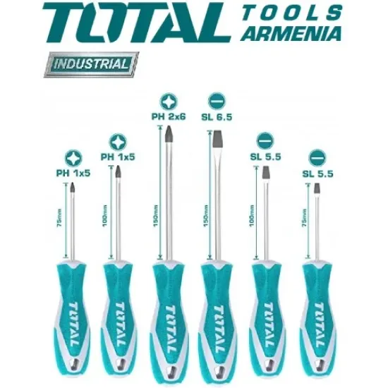 TOTAL THT250606 -  հավաքածուն բաղկացած է 6 պտուտակահաններից , որոնցից երեքը տափակ են , իսկ մյուս երեքը ՝ խաչաձև : Հավաքածուն օգտագործվում է ամրացումների  հետ կապված աշխատանքնե կատարելիս : Հավաքածուի մեջ պտուտակահանների երկարությունը կազմված է 75 - ից 150 մմ : Գործիքի ձողերը պատրաստված են գերհզոր քրոմ վանադիումի պողպատից , իսկ էրգոնոմիկ բռնակները ՝ հակասայթաքող պոլիմերային նյութերից :