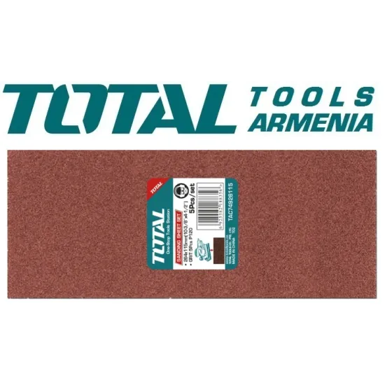 TOTAL TAC74926115 հղկող թերթերի հավաքածուն փոխարինող տարր է հղկող մեքենաների համար և օգտագործվում է փայտի , մետաղի վերամշակման , ներկի և լաքի ծածկույթների և ժանգի վերացման համար : Թիթեղները փորված են` հղկվող փոշին ավելի լավ հեռացնելու համար : Ձևը հարմար է փոքր տարածքների անկյունների և մակերեսների հղկման համար : Պատրաստված է գործվածքների վրա հիմնված ալյումինե օքսիդից :